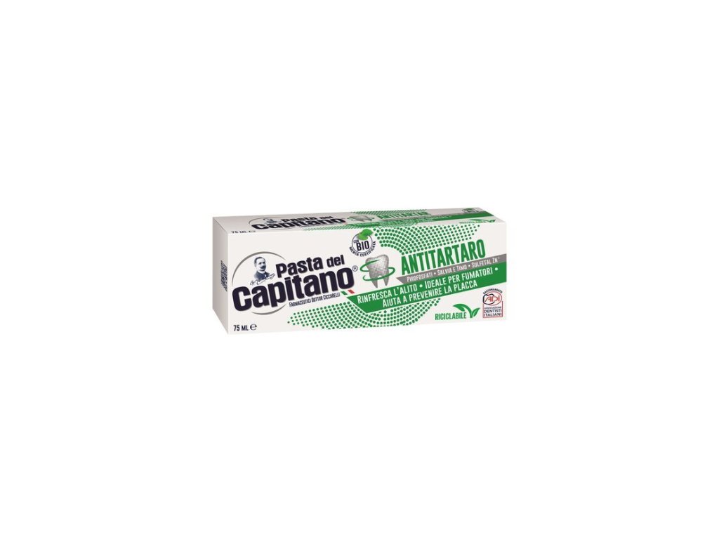 Zubná pasta ANTITARTARO vďaka výťažkom zo šalvie a tymiánu a prítomnosti pyrofosfátov pomáha predchádzať tvorbe bakteriálneho povlaku spôsobujúceho zubný kameň a osviežuje dych.