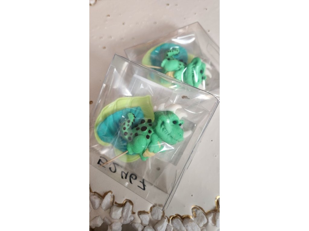 Cukrová dekorácia v podobe dinosaura na zápichu a tropického listu.