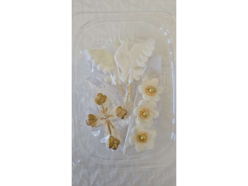 Zloženie: pbiely cukor, VAJEČNÝ albumín, regulátor kyslosti E330, zahusťovadlo E412, konzervant kyselina sorbová (E200), potravinárska artóma vanilka, potravinárske farbivo: E133, E102, E110, E132, E124, E170,