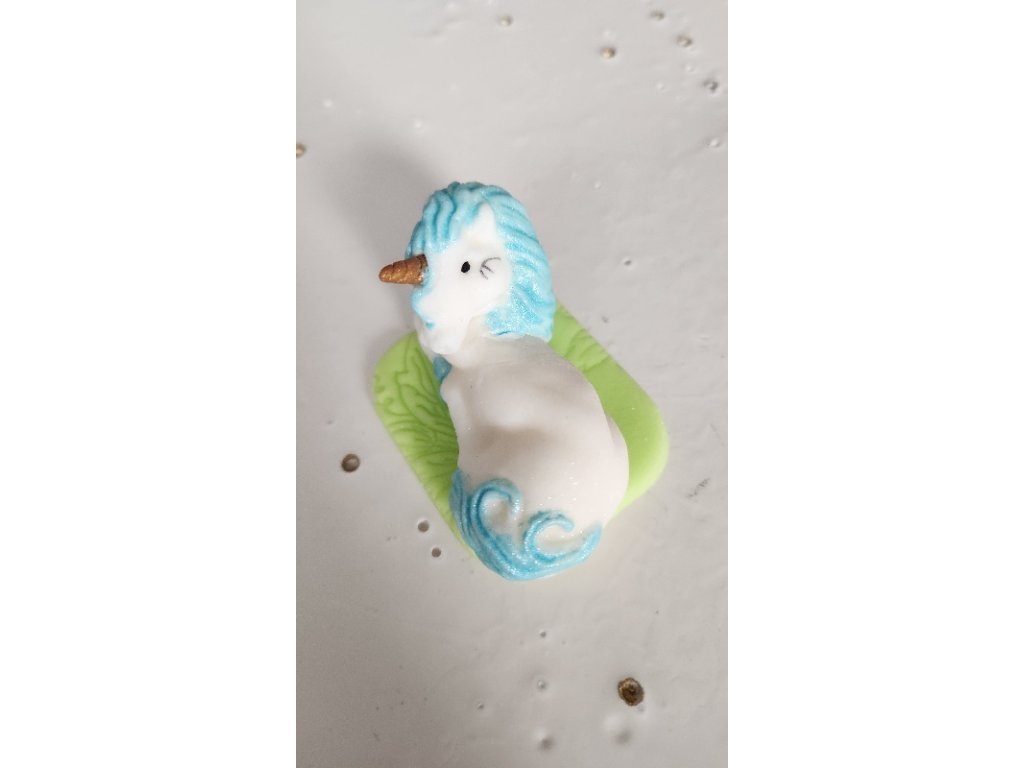 Cukrová dekorácia v podobe bieleho jednorožca s bielou hrivou.