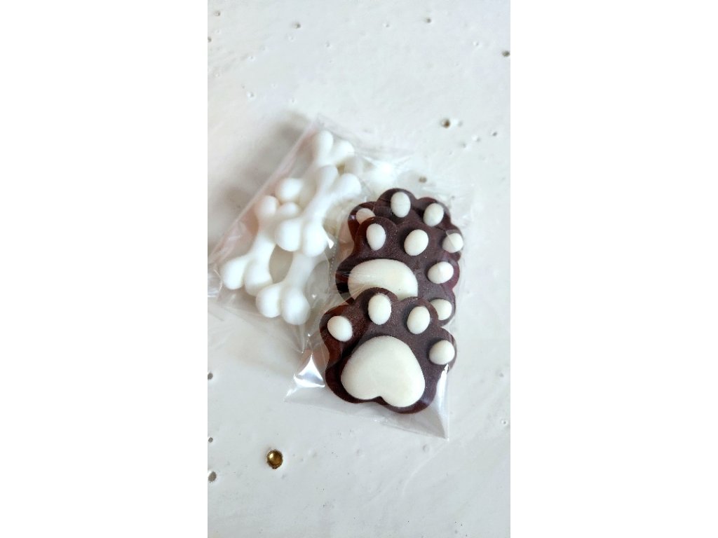 Rozmery: labka-D-5cm x Š-4cm x V-0,5cm, kostička- D-4cm x Š-1,5cm x V-0,5cm