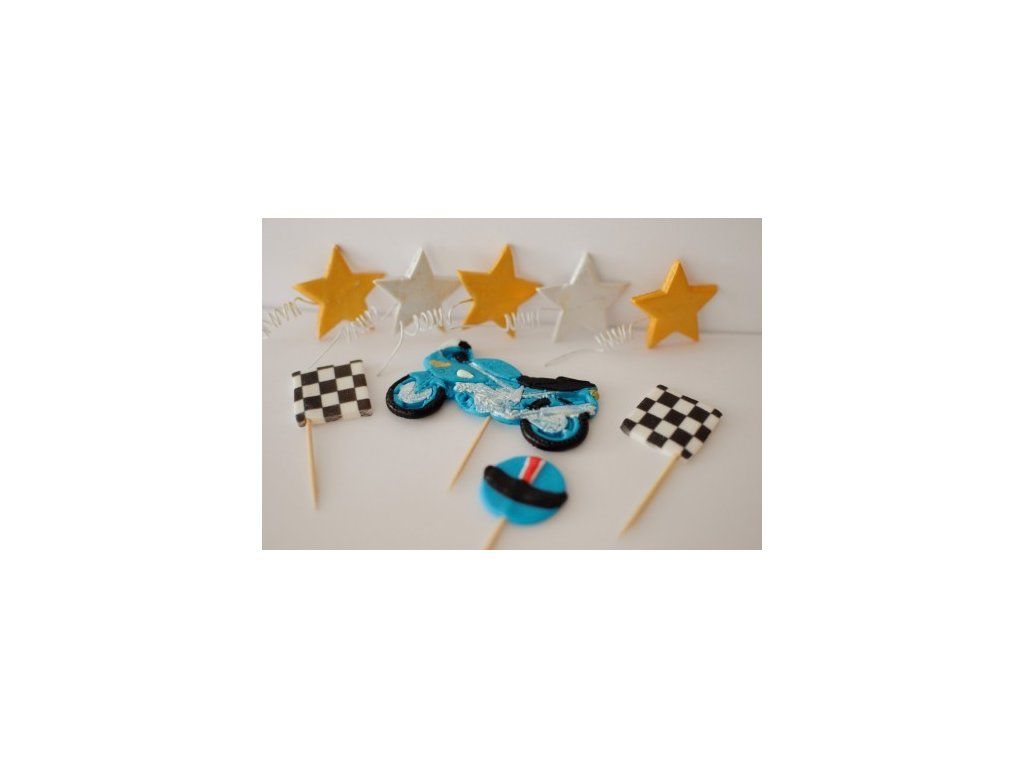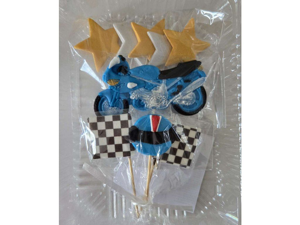 Cukrová dekorácia na tortu Motorka sada zápichov 2D. V balení aj s hviezdičkami.