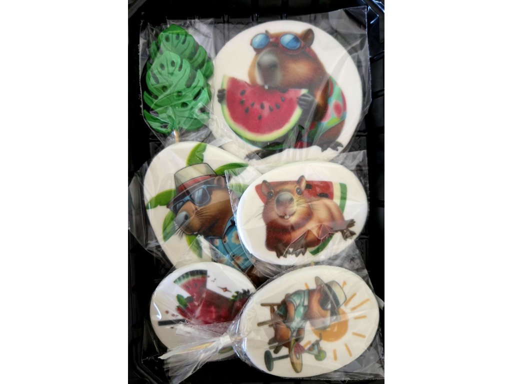 Zloženie: biely cukor vaječný albumín, cukrársky tuk, kryštalická glukóza, glycerín, zahusťovadlá E 412, E 415, E 466, kukuričný škrob, modifikovaný kukuričný škrob, regulátor kyslosti E 330, konzervant E 200, potravinárska aróma „Vanilka“, potravina farbivo Е 102, Е 110, Е 133, Е 124, Е 132, Е 170, Е 172, Е 175. Obsahuje farbivo ( Е102, Е124, Е110, ktoré môže mať nepriaznivé účinky na činnosť a pozornosť detí)