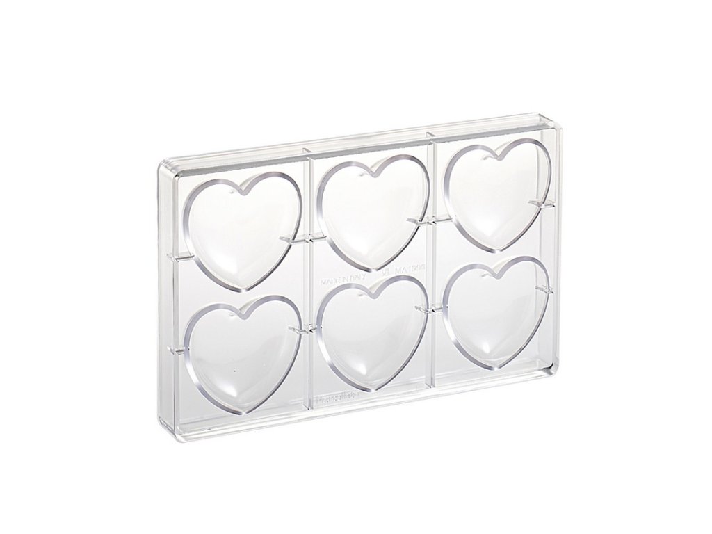 Polykarbonátová forma na čokoládu a pralinky MA1996 od talianskeho výrobcu Martellato, u ktorého možno zaručiť prvotriednu kvalitu produktu. Veľmi kvalitný materiál, z ktorého je forma vyrobená umožňuje pohodlnú prácu s čokoládou, ktorá sa nerozlieva mimo formu a výsledný efekt je precízny a naprosto dokonalý. Forma na čokoládu MA1996 o rozmeroch 275x175 mm, je vhodná k vyrobení 6 ks čokoládových praliniek o rozmeroch 75x70x22 mm, v tvare srdce. Forma je vhodná do umývačky riadu. Forma je nenahraditeľný spoločník pre profesionálnych cukrárov ale i pre amatérov, ktorí milujú domáce pečenie.