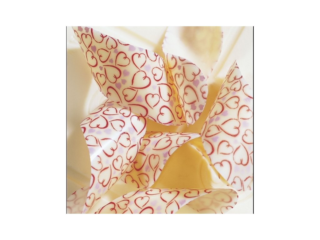 Fólia na prenos dekoratívneho vzoru na povrch čokolády. Práca s fóliou je jednoduchá - rozohrejeme čokoládu a nanesieme na fóliu v požadovanej vrstve (zakrytie bokov tort alebo na stáčanie do obrazcov). Pri teplote +4 až + 8 ° C dochádza do 20 minút k stuhnutiu čokolády a po odstránení fólie zostane na povrchu čokolády vybraný dekor. Vzor na fólie je z kakaového masla, preto pri manipulácii dbajte na minimálny kontakt s prstami.