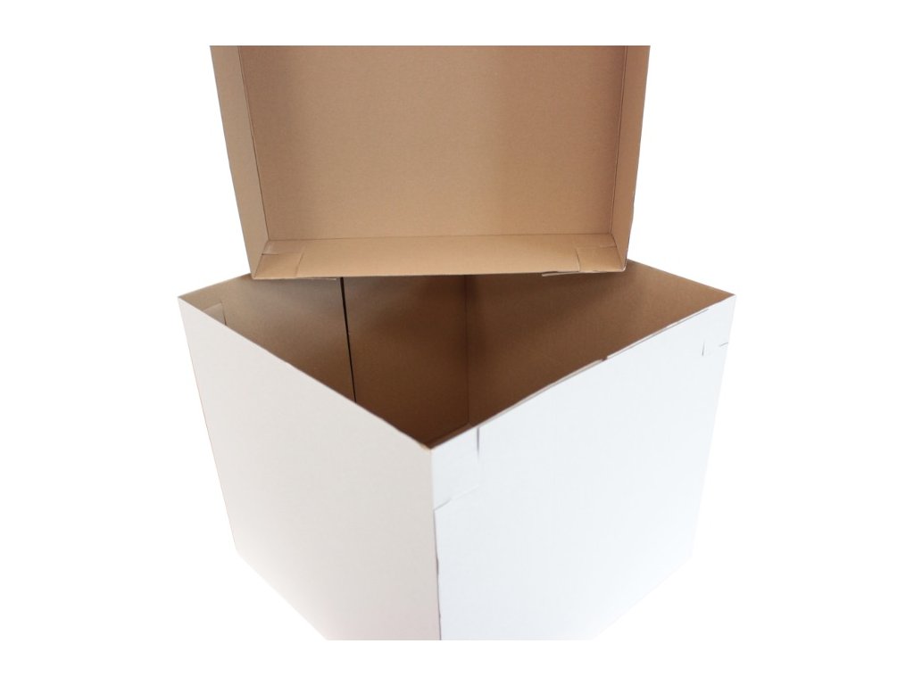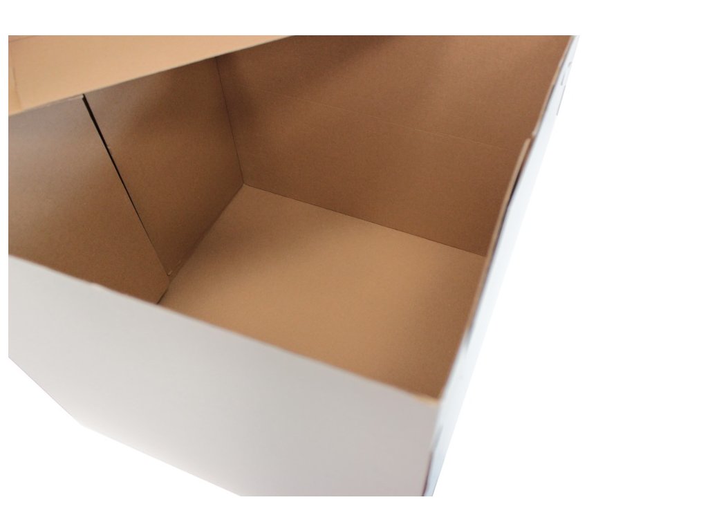 Krabička z vlnitej lepenky. Obaly sú vhodné najmä na bezpečnú prepravu väčšieho množstva zákuskov alebo torty. Vlnitá lepenka lepšie chráni koláče pred otrasmi a nepriazňou počasia.