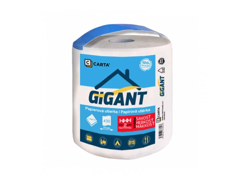 Utierka Gigant je 2-vrstvová papierová utierka zo 100% celulózy s extra veľkým návinom a 430 útržkami. Je vyrobená vylepšenou technológiou Point to Point embossing, ktorá zvyšuje jej savosť a mäkkosť. Utierka Gigant je vybavená odnosným pútkom pre ľahkú manipuláciu a vyťahovacou dutinkou, vďaka ktorej je možné aj odvíjanie zvnútra. Materiál je príjemný na dotyk a je vhodný pre použitie na ľudskú pokožku aj všetky typy povrchov. Utierka Gigant je univerzálna utierka vysokej kvality s veľkým návinom, ideálna pre použitie v domácnosti a vo firmách.
