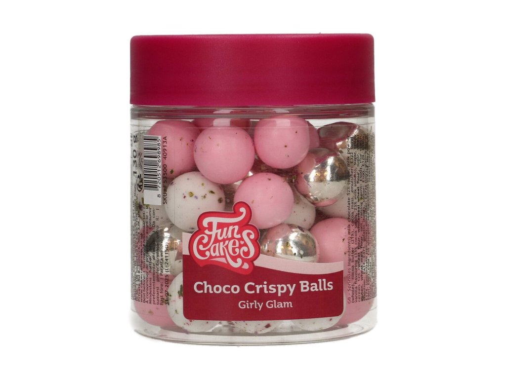 FunCakes Choco Crispy Balls patria do našej prémiovej rady posýpiek, ktoré spoznáte podľa špeciálnej dózy s fialovým vrchnákom. Tieto veľké čoko guľôčky (ø15 mm) majú lahodný chrumkavý stred a cukríkový vonkajší povrch, vďaka čomu sú nielen najkrajším doplnkom vašich maškŕt, ale aj najchutnejšími. Čokoláda použitá na tieto guličky dodá vašim maškrtám luxusnú chuť a trendy farebné kombinácie zaistia elegantný vzhľad. Pôjdete do našich tematických kombinácií? Alebo uprednostňujete použitie obyčajných farieb na vytvorenie vlastných jedinečných návrhov? Tak či onak, užite si kreativitu s našou najprémiovejšou radou posypov!