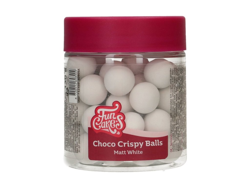 FunCakes Choco Crispy Balls patria do našej prémiovej rady posýpiek, ktoré spoznáte podľa špeciálnej dózy s fialovým vrchnákom. Tieto veľké čoko guľôčky (ø15 mm) majú lahodný chrumkavý stred a cukríkový vonkajší povrch, vďaka čomu sú nielen najkrajším doplnkom vašich maškŕt, ale aj najchutnejšími. Čokoláda použitá na tieto guličky dodá vašim maškrtám luxusnú chuť a trendy farebné kombinácie zaistia elegantný vzhľad. Pôjdete do našich tematických kombinácií? Alebo uprednostňujete použitie obyčajných farieb na vytvorenie vlastných jedinečných návrhov? Tak či onak, užite si kreativitu s našou najprémiovejšou radou posypov!