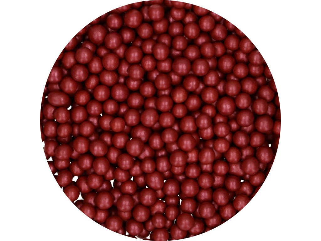 FunCakes čokoládové perly, jedlé bordové perly veľkosti 6mm. Je možné ich použiť na mnoho rôznych spôsobov zdobenia, napríklad na kvety alebo retiazku/lem okolo torty.