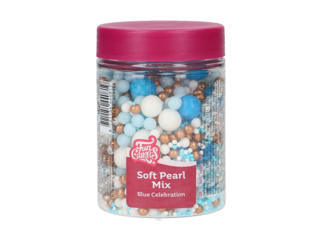 Zmes mäkkých perál FunCakes dodá vašim tortám, muffinom a sušienkam krásny záverečný nádych. Táto zmes perál v rôznych veľkostiach má jemné zhryznutie a elegantný lesk, ideálna na každú slávnostnú príležitosť. Vďaka svojmu jemnému zhryznutiu sú ideálne pre mladých aj starých! Či už zdobíte svadobnú tortu, maškrty na bábätku alebo narodeninové muffiny, tieto perly vždy vytvoria magický vzhľad! Zmes mäkkých perál FunCakes Blue Celebration je ideálna na zdobenie torty na párty s odhalením pohlavia alebo na bábätku.