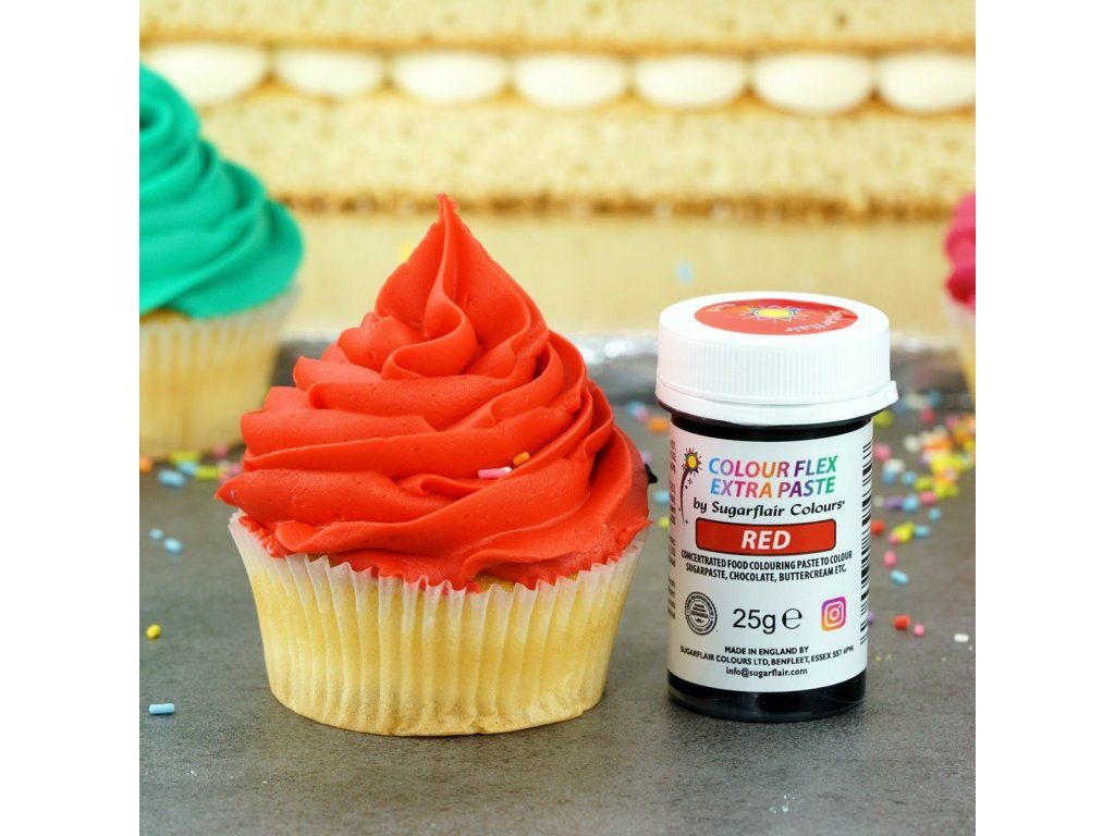Extra koncentrované potravinárske farbivo Colour Flex v červenej farbe. Na dosiahnutie žiarivého a profesionálneho sfarbenia potrebujete len malé množstvo tejto pasty.