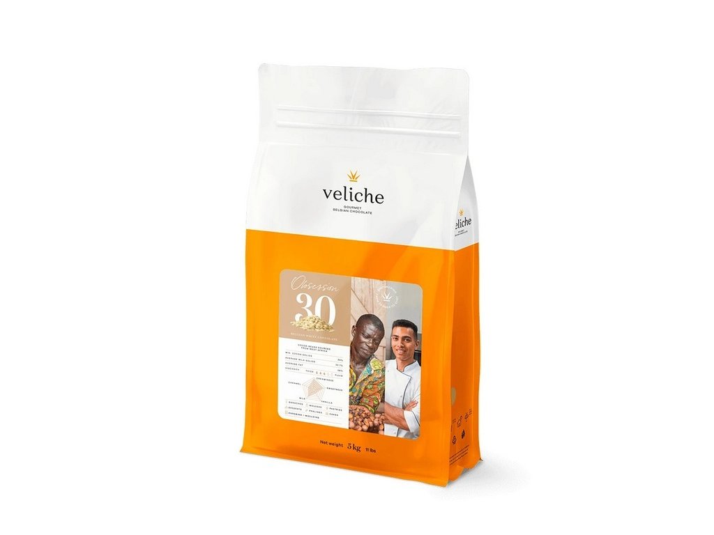 Veliche White Obsession 30% je kvalitná biela čokoláda s intenzívnou, krémovou chuťou. Obsahuje minimálne 30% kakaových výrobkov a až 36% kakaového masla, čo zaručuje mimoriadny chuťový zážitok. Navyše, vďaka obsahu 22,7% sušeného mlieka má táto čokoláda mimoriadne zamatovú konzistenciu.