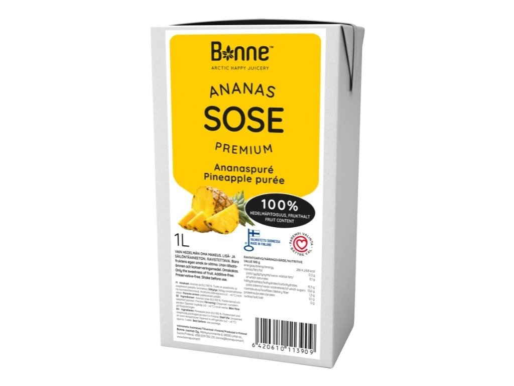 Pasterizované ovocné pyré marakuja, asepticky zabalené. Zloženie: Ananás. Distribútor: Bonne Juomat Oy, Mäntynummentie 8, 08500 Lohja, Fínsko.